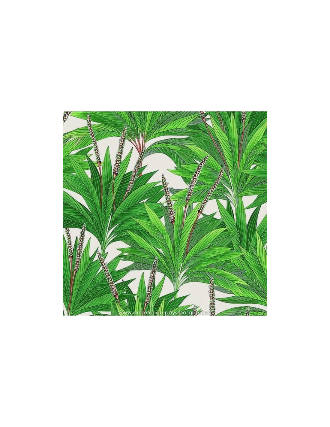 Une cure de détox pour votre intérieur, ce tissu d'ameublement en 280 cm sur une toile de coton de la maison Thevenon Paris : feuillages énergie verte intense, imbibés de chlorophylle laissera pour cet été un look, une déco fraîche, fun et légère : un bain d’oxygène pour stimuler nos esprits. Ici sur un fond crème