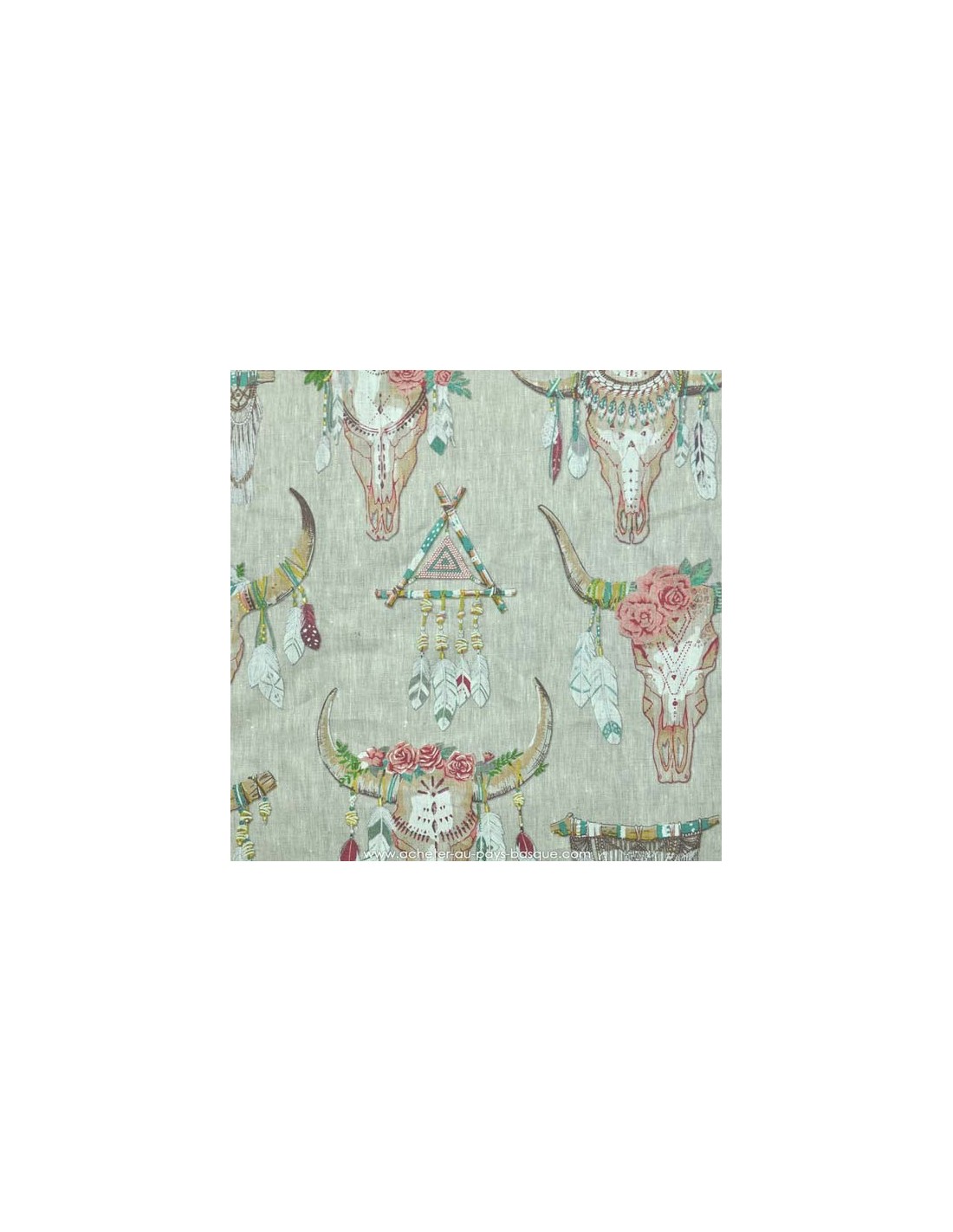 Tissu lin motifs indiens crânes animaux fleurs et plumes, laize de 155 cm.