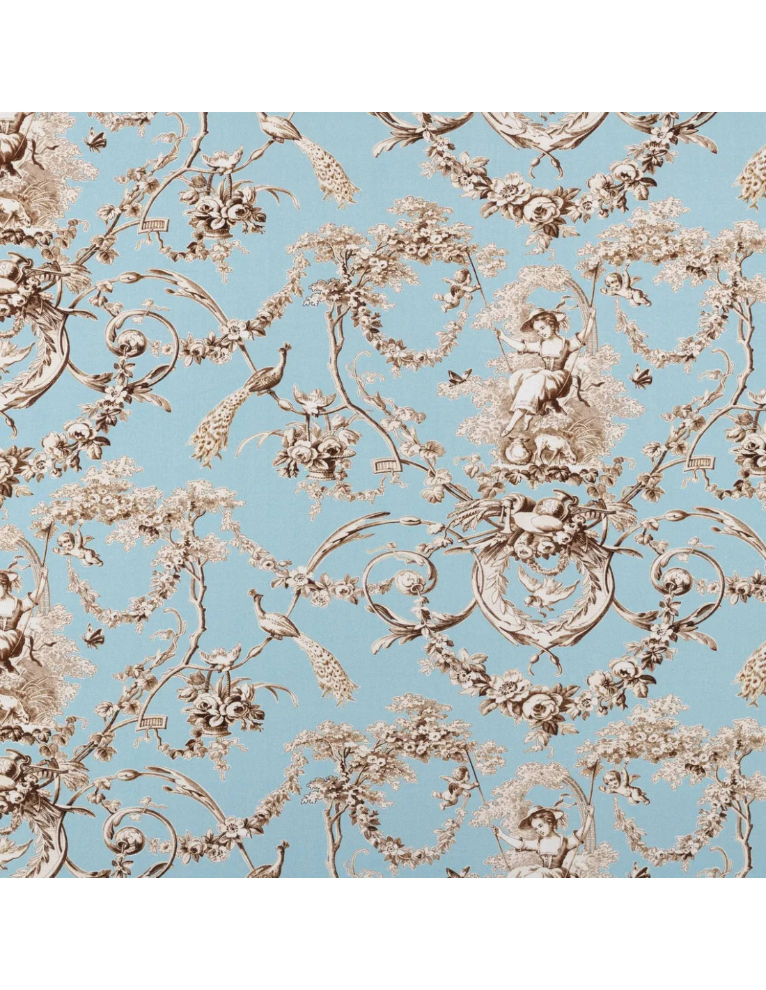 Tissu d'ameublement en percale de coton édité par la maison Thévenon, joli motif toile de jouy, une Demoiselle qui se balance parmi de grands feuillages, des paons, bouquets, petits anges et autres ornements. Idéal pour du linge de lit