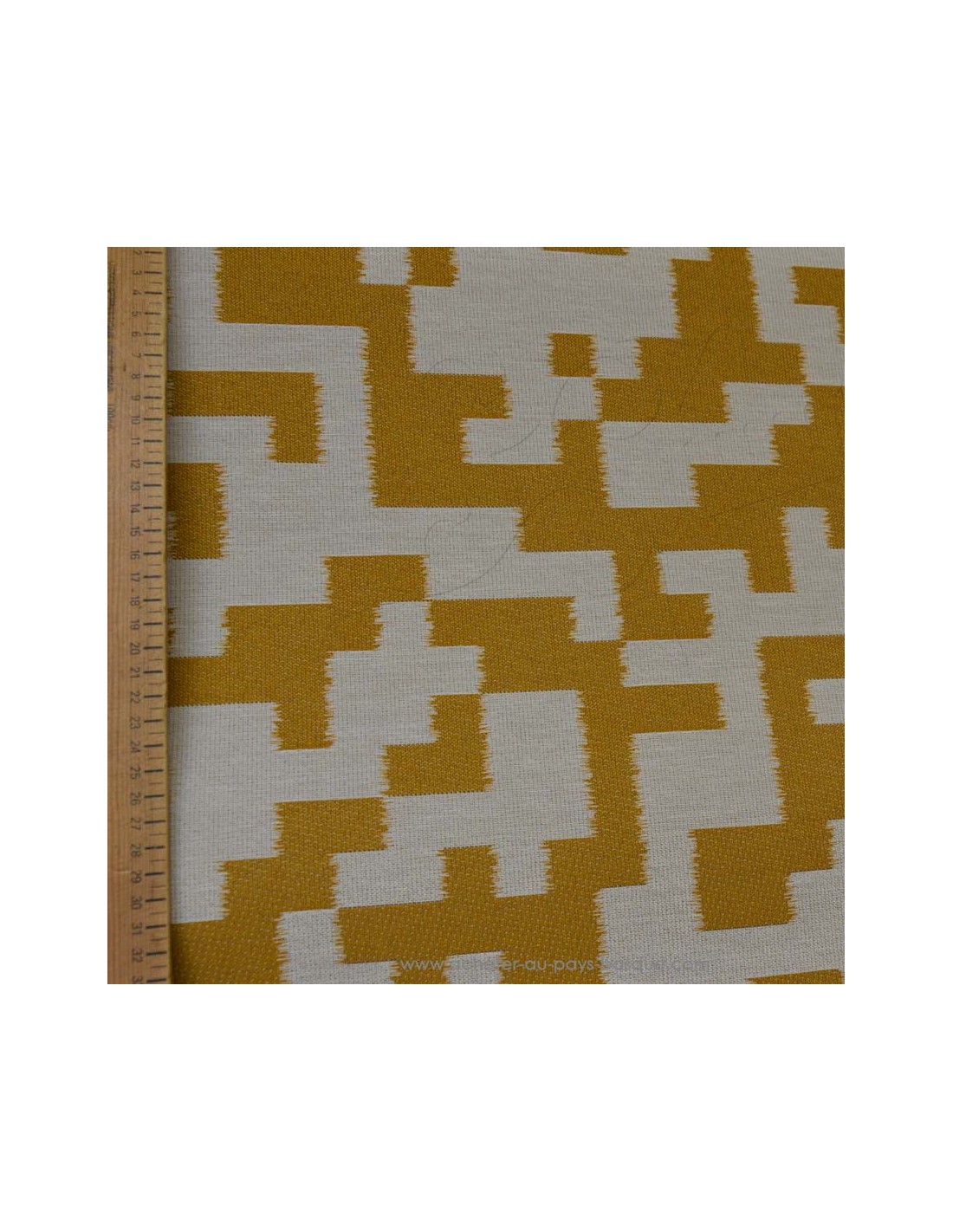 Ce tissu d'ameublement extérieur traité téflon aux motifs géométriques moutardes et blancs , tel le célèbre jeu du tetris, matière de qualité professionnelle est parfait pour la création de coussins canapé d'extérieur, bains de soleil, transat, chilienne, etc... mais aussi pour des cousettes types sac et accessoires.