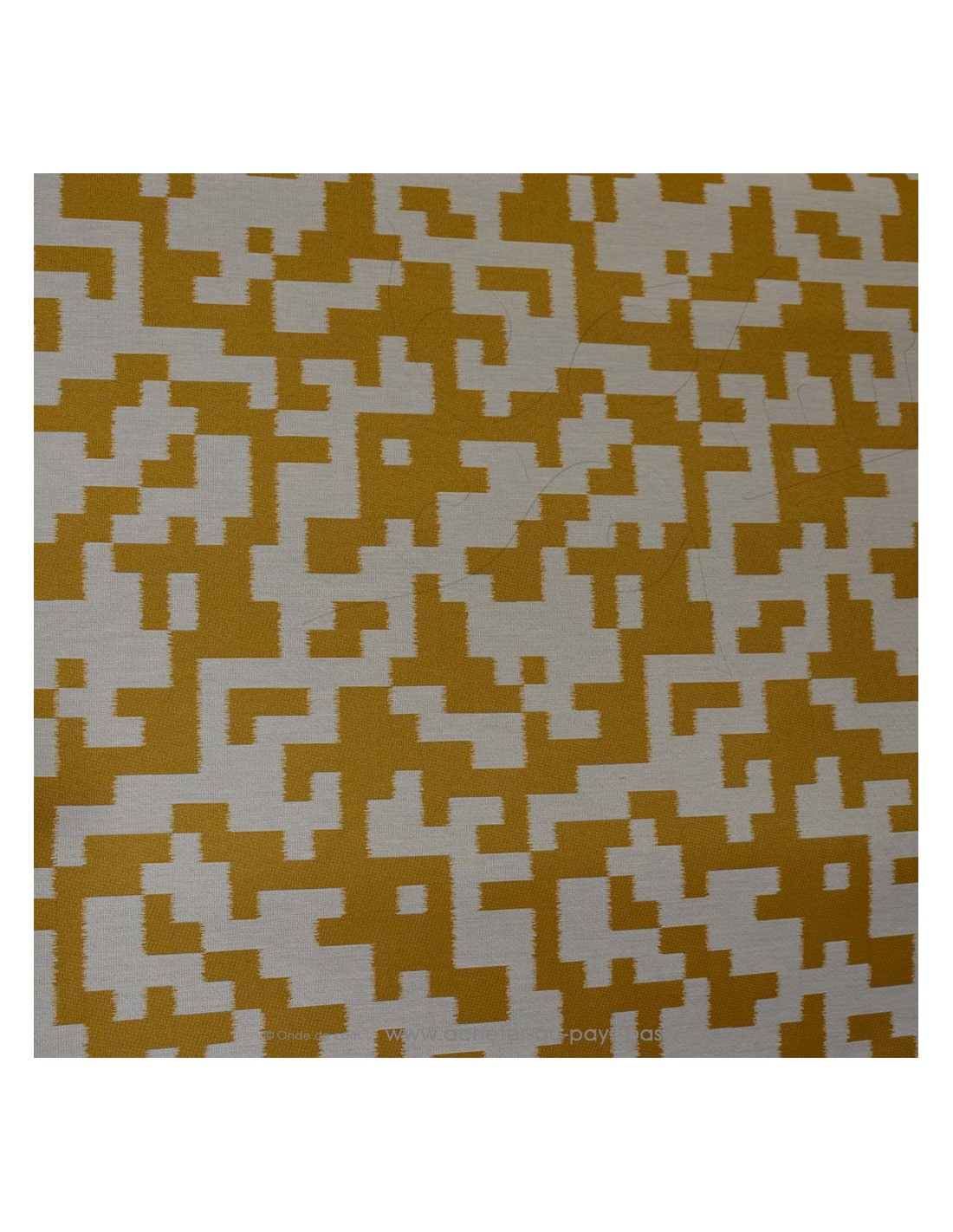 Toile extérieure motifs géometriques / outdoor, déperlant mais pas imperméable, style tetris moutarde et blanc