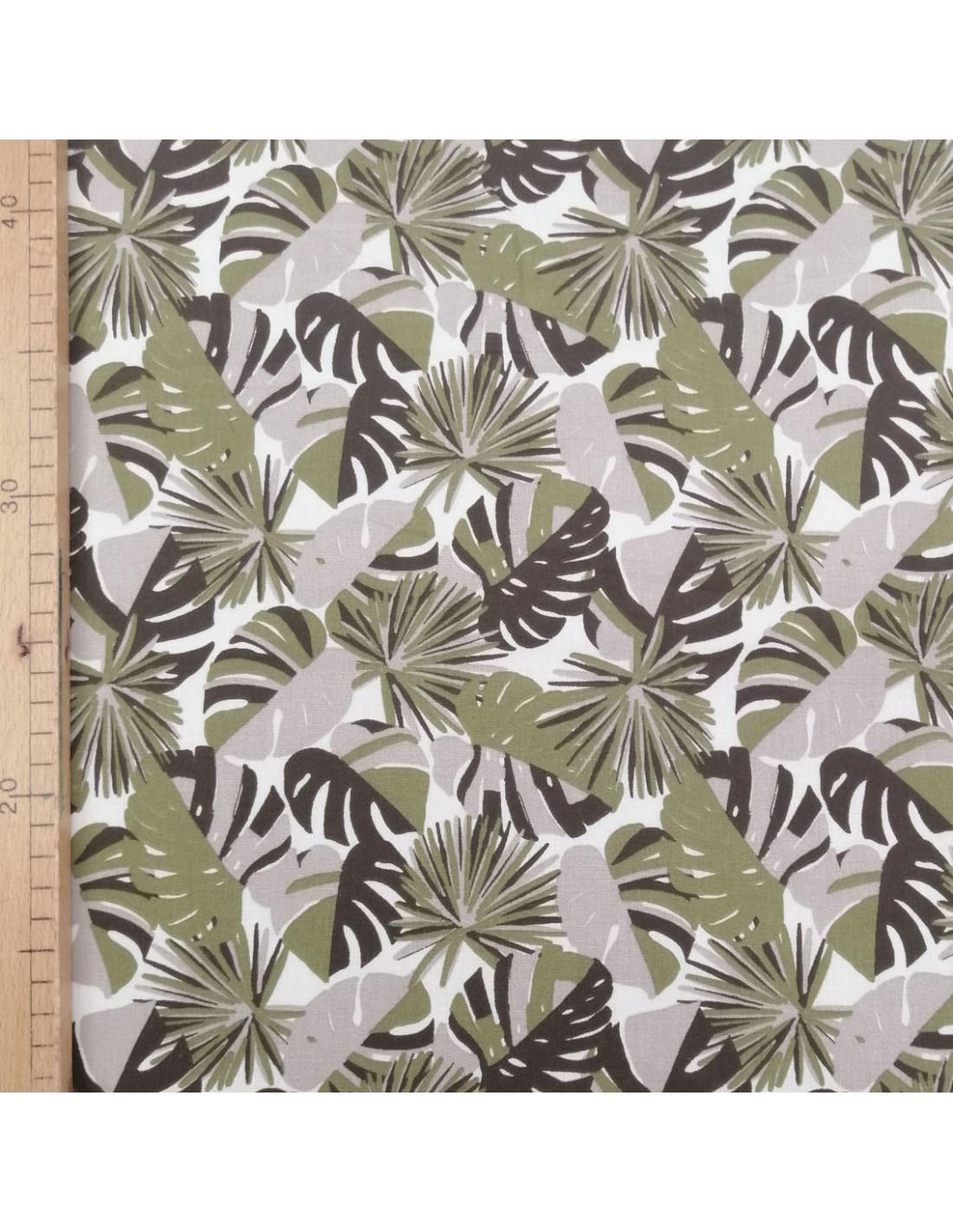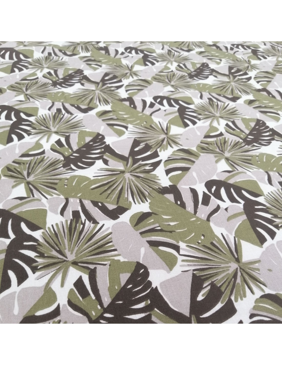 Tissu 100% coton, laize de 150 cm, avec motif feuillage, feuilles de palme bicolore kaki gris