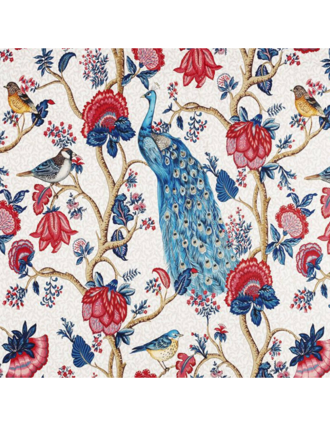 Le Tissu "ALEXANDRA" de la maison Thévenon aux motifs de fleurs, feuillages oiseaux et paon majestueux déployant sa magnifique queue, imprimé sur une percale de coton fond blanc, est idéal pour la confection de rideaux sur mesure, coussins, panneaux japonais, dessus de lit, réfection de sièges, fauteuils et canapés...