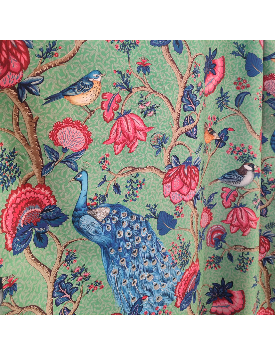 Le Tissu "ALEXANDRA" de la maison Thévenon aux motifs de fleurs, feuillages oiseaux et paon majestueux déployant sa magnifique queue, imprimé sur une percale de coton fond vert, est idéal pour la confection de rideaux sur mesure, coussins, panneaux japonais, dessus de lit, réfection de sièges, fauteuils et canapés...