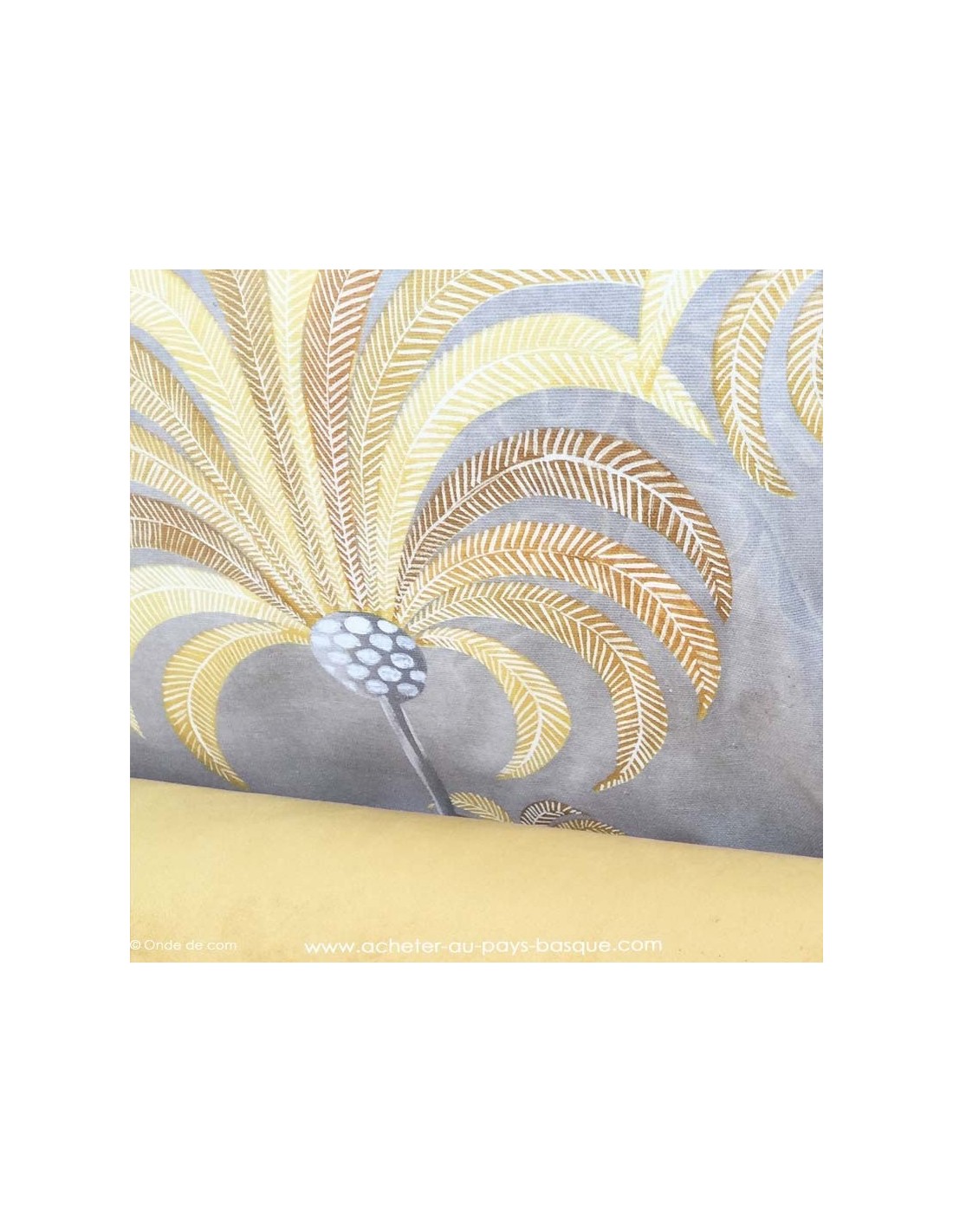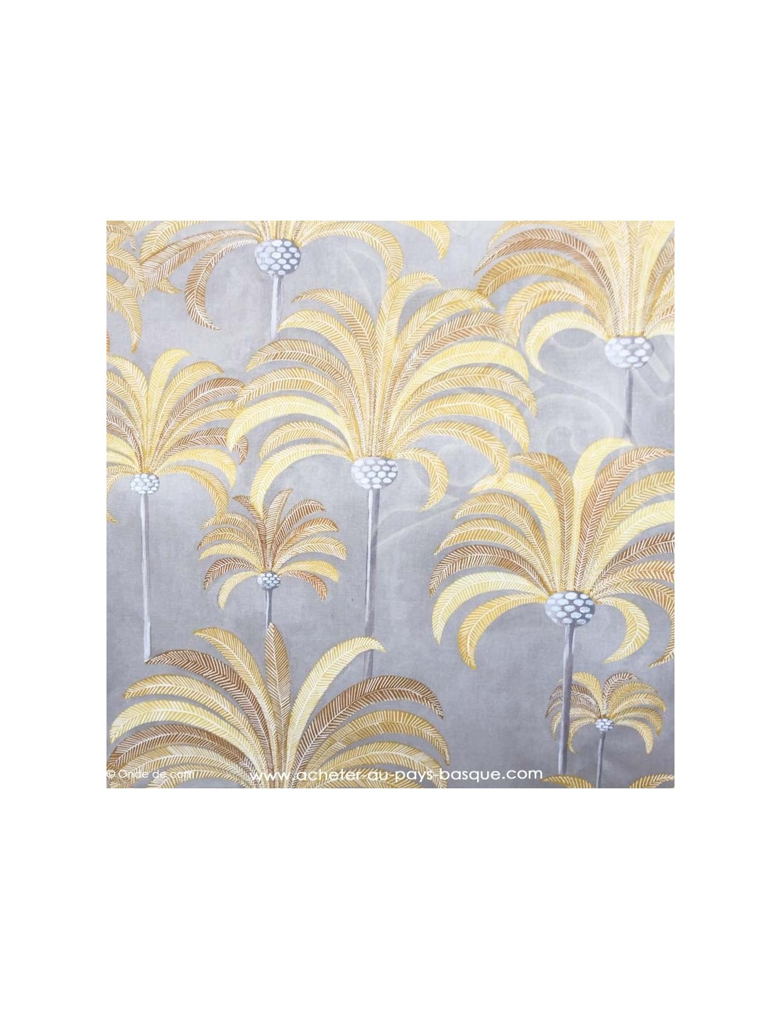 La Palmeraie moutarde sur fond ficelle est 100% coton. Un palmier mesure 44 x 32 cm