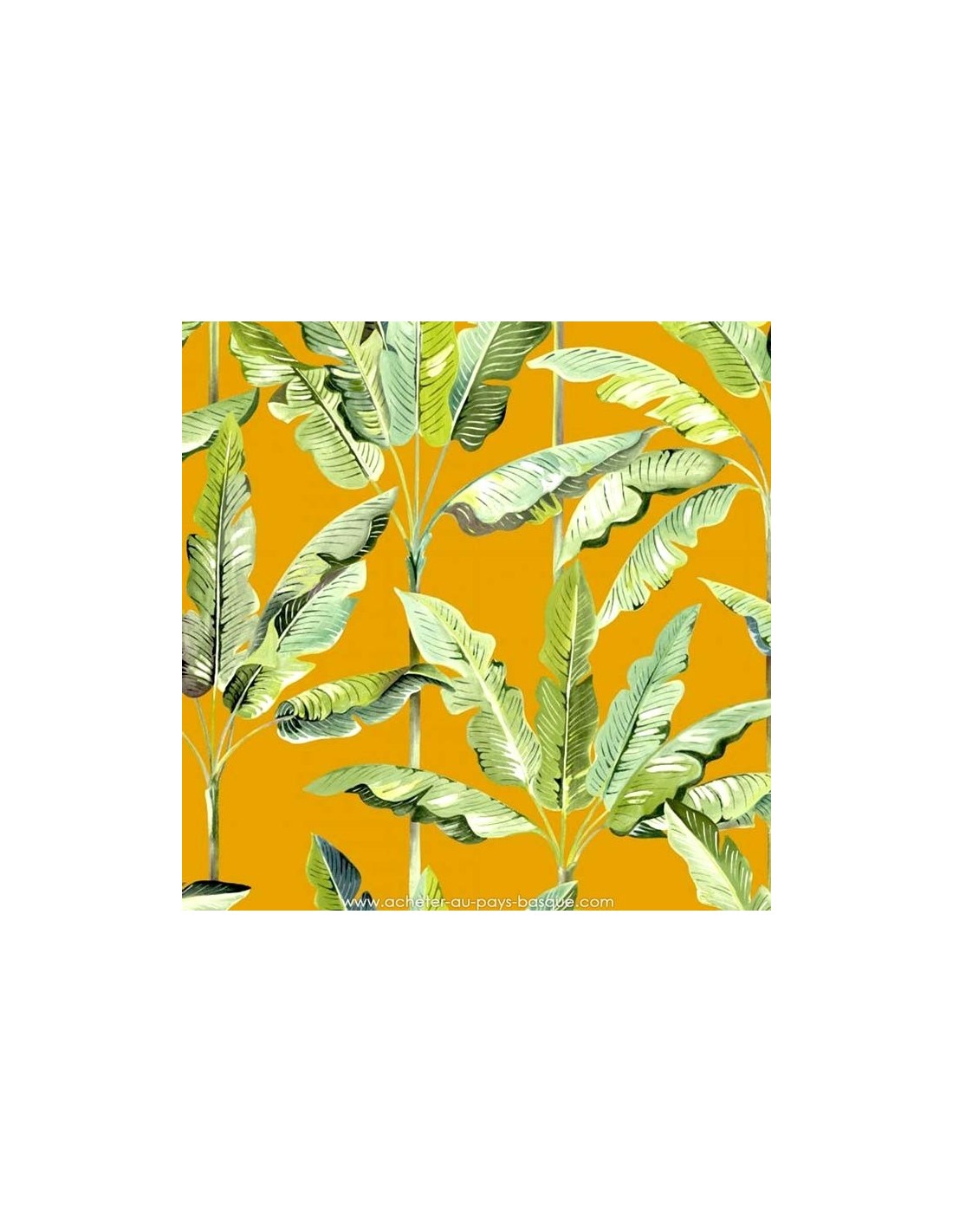 Ce tissu d'ameublement de la nouvelle collection Automne Hiver 2018 de la maison Thevenon, donnera un air de voyage exotique tropique tropical avec ces feuilles de bananier sur un fond vif orange pour un bain de soleil ...