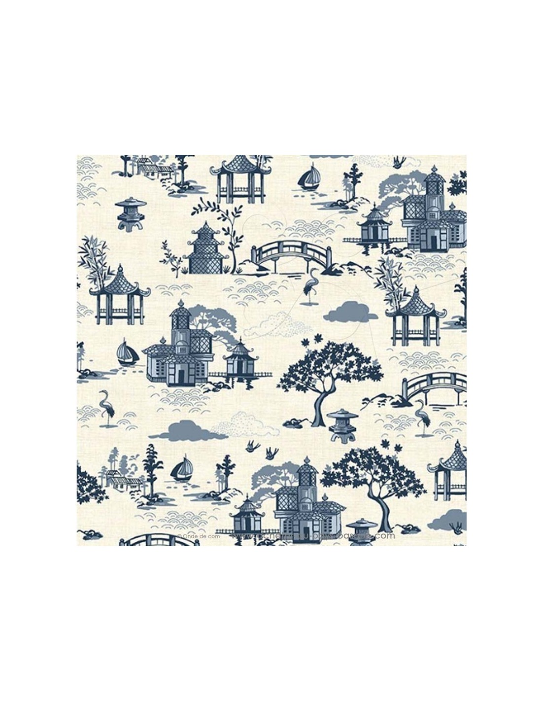 Coton de lin "INDIGO" Patchwork temple japonais fond écru