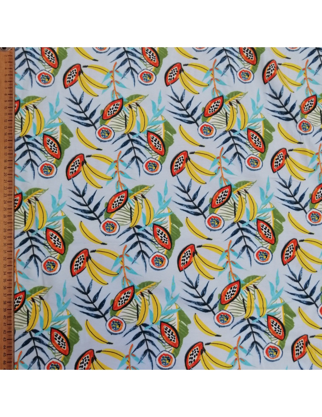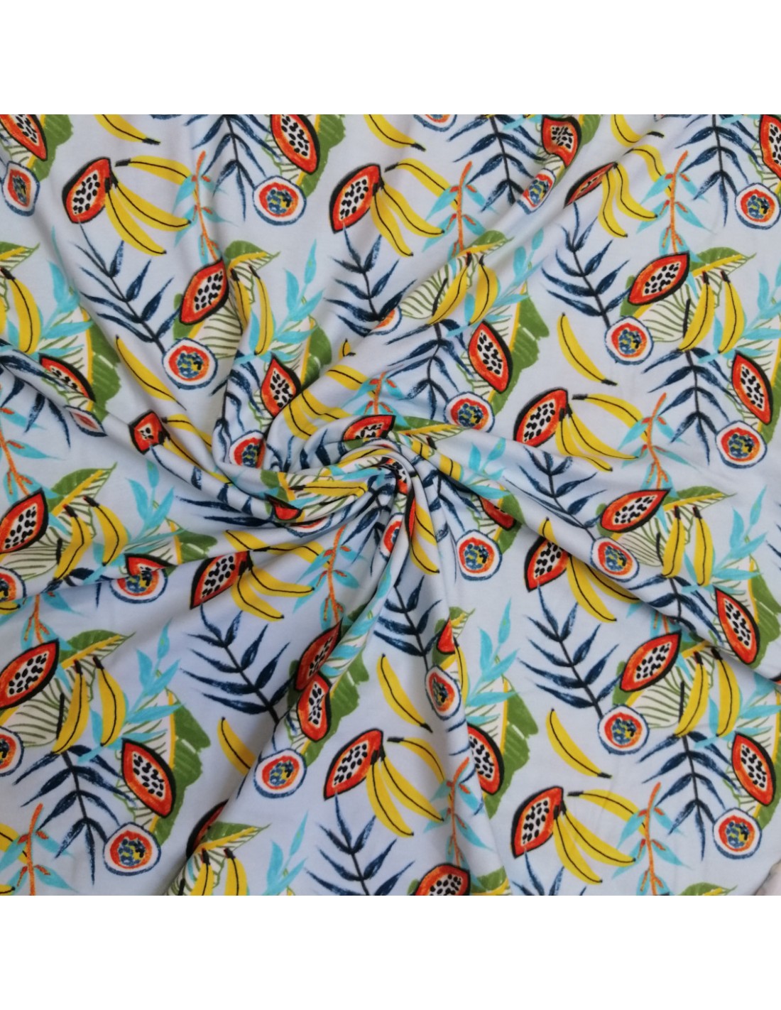 Jersey coton fruits exotiques bananes papaye passion fond bleu ciel