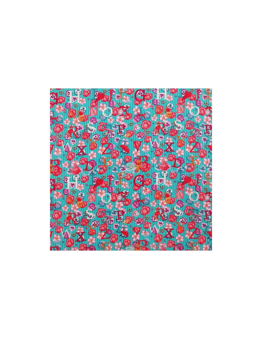 Ce joli tissu d'habillement imprimé des lettres de l'alphabet et fleurs roses  et colorées sur fond bleu à rayures est le tissu idéal pour vos petites cousettes d'été. Fluide et léger il convient parfaitement pour des chemises, robes, jupes, blouses et pantalons légers...