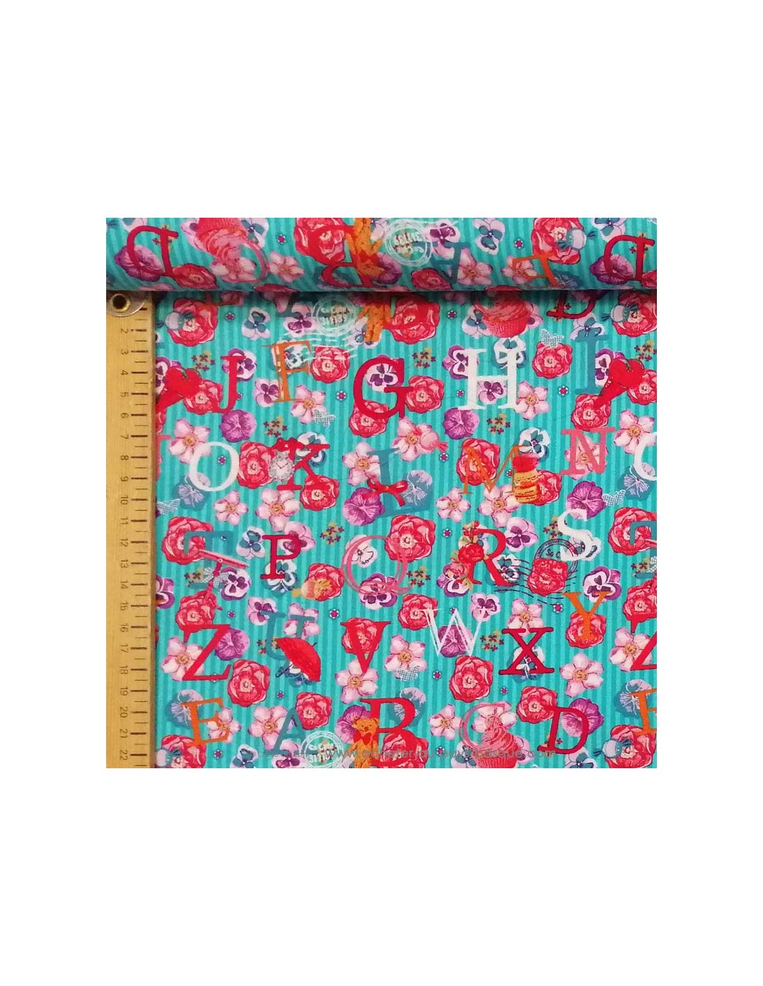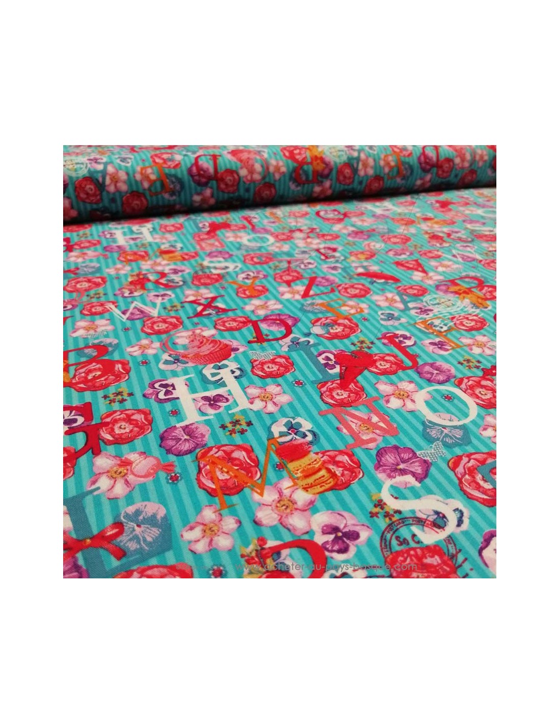 Joli tissu habillement Coton Oeko-Tex imprimé fleurs et lettres alphabet sur fond rayé bleu