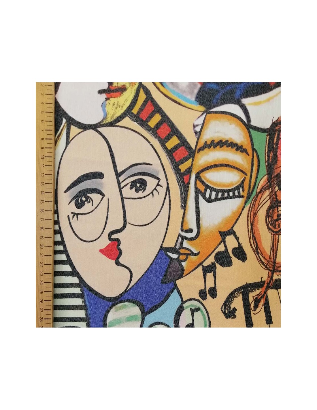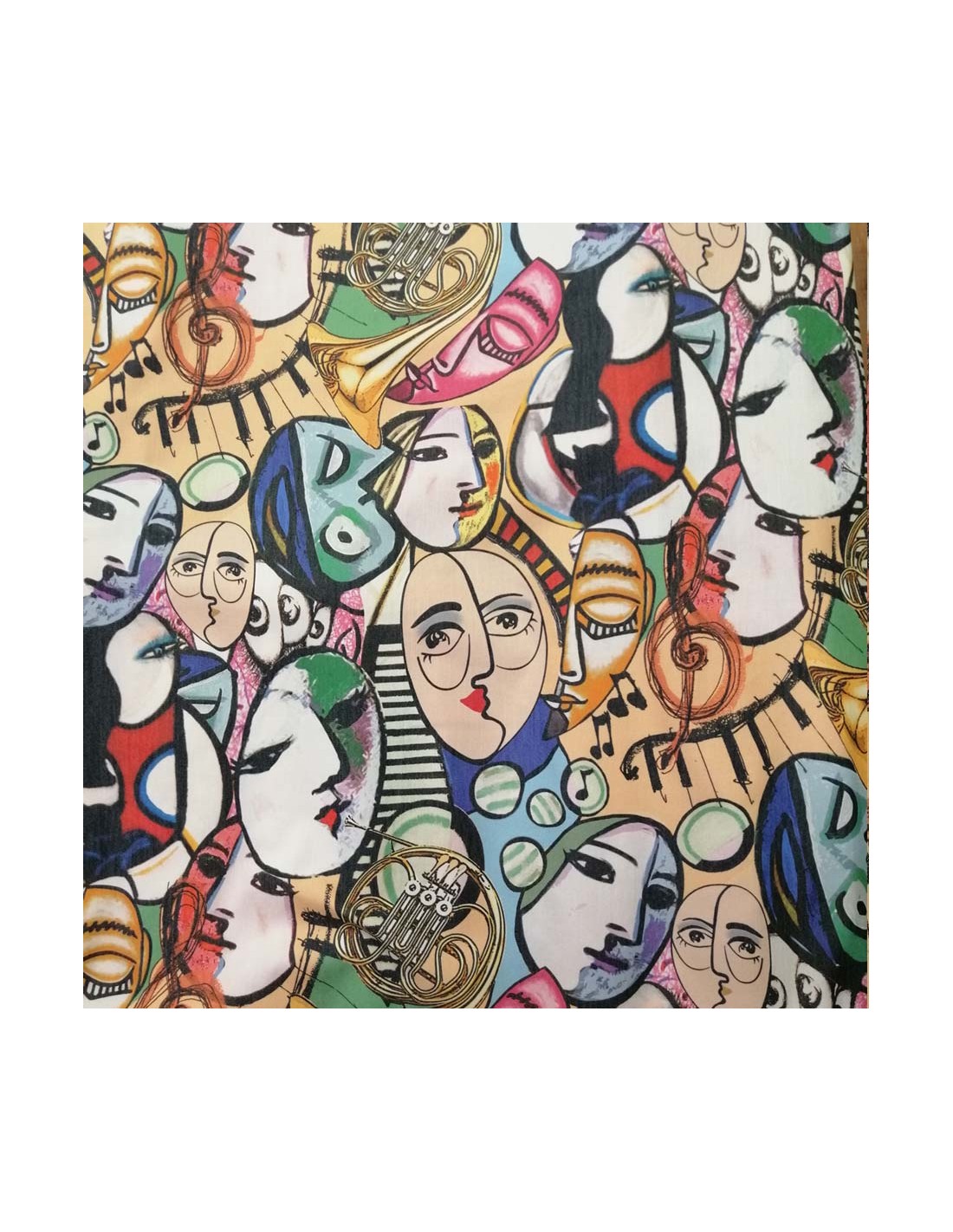 Ce joli tissu d'habillement Jean élastane stretch blanc aux motifs de visages abstraits peints entremêlés avec des instruments de musique est le tissu idéal pour vos petites cousettes fun et colorée, voir totalement décalée !. Fluide, il convient parfaitement pour des tops, vestes, pantalons, shorts, jupes, robes...