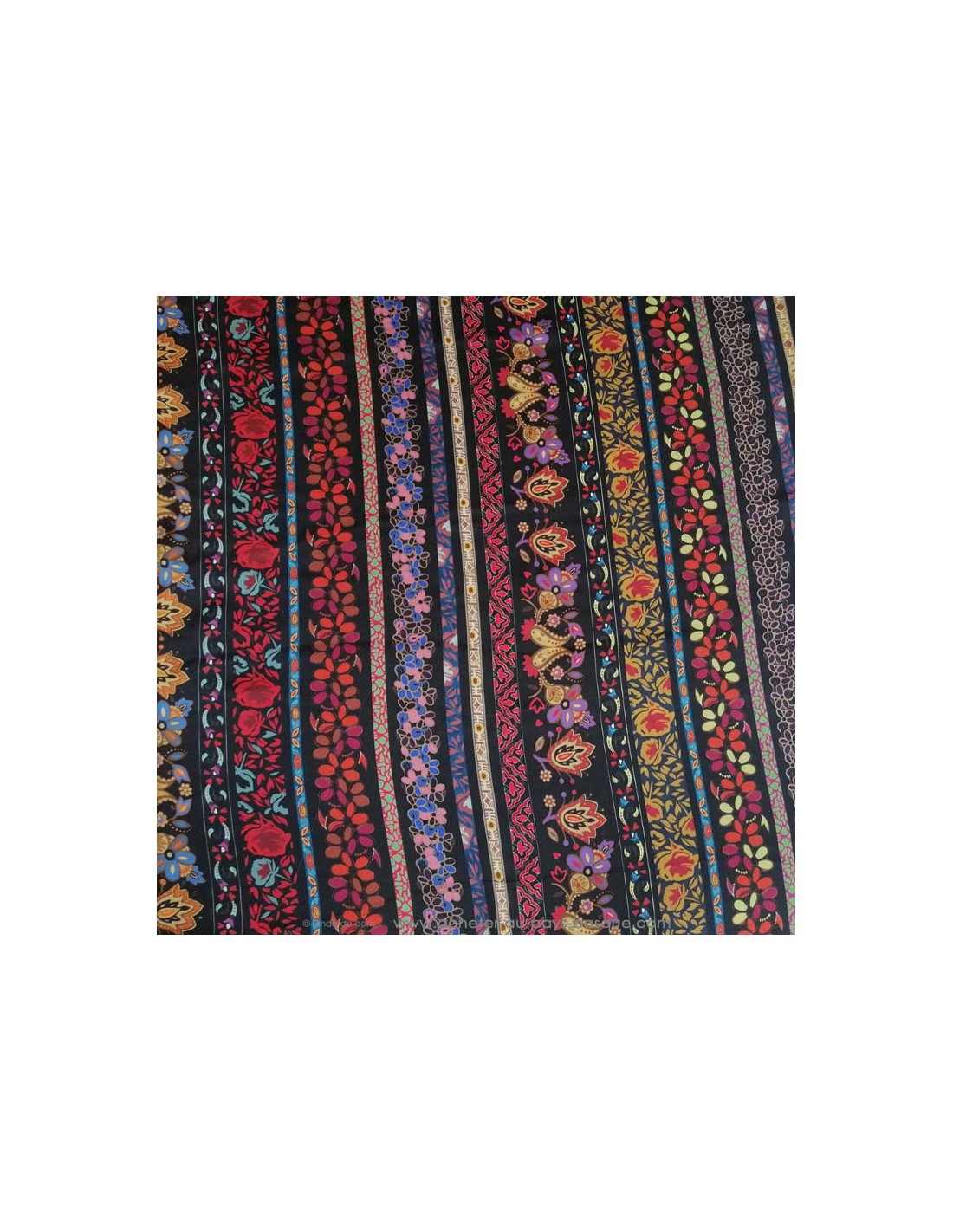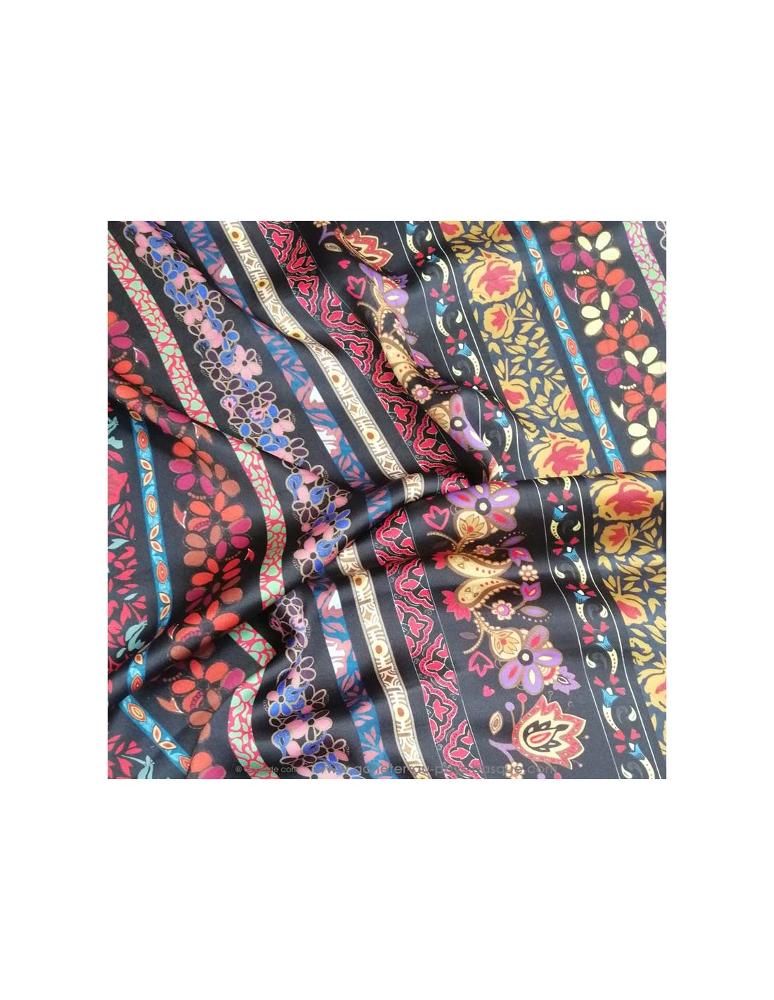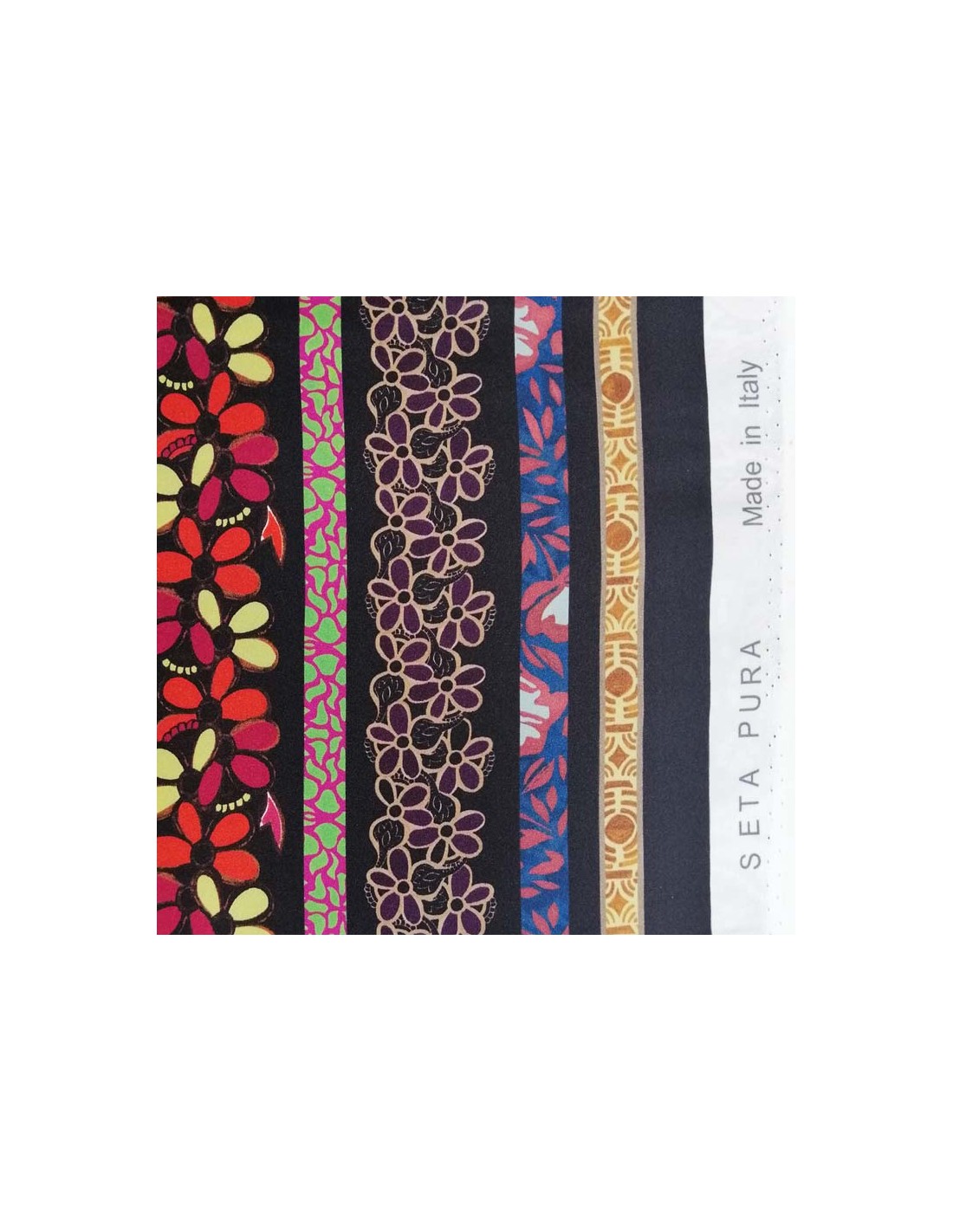 Tissu 100% soie noire ornée de bandes de fleurs - made in Italie