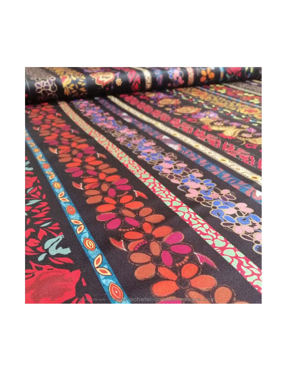 Tissu 100% soie noire bande fleurie made in Italie - tissus habillement soie italienne haute couture - vetement sur mesure