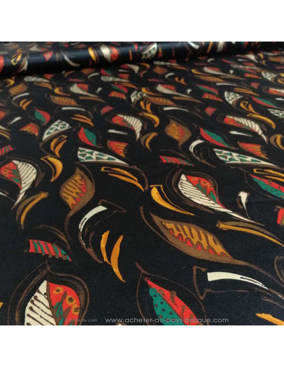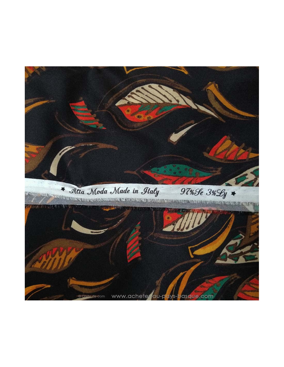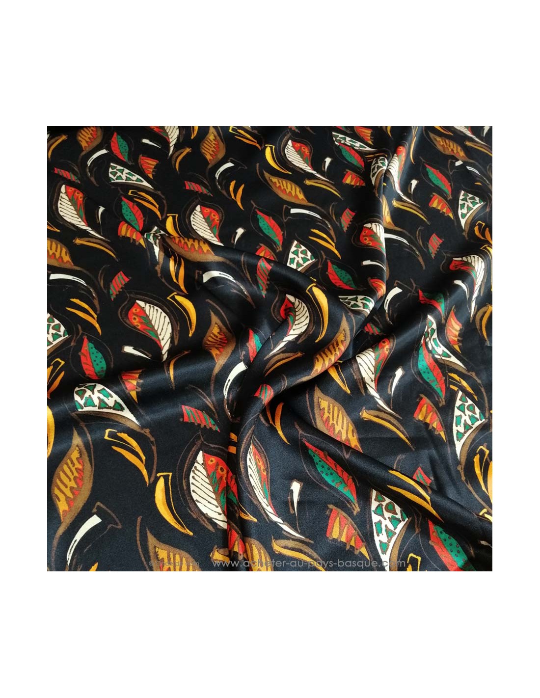 Tissu soie italienne noire feuilles motifs ethniques