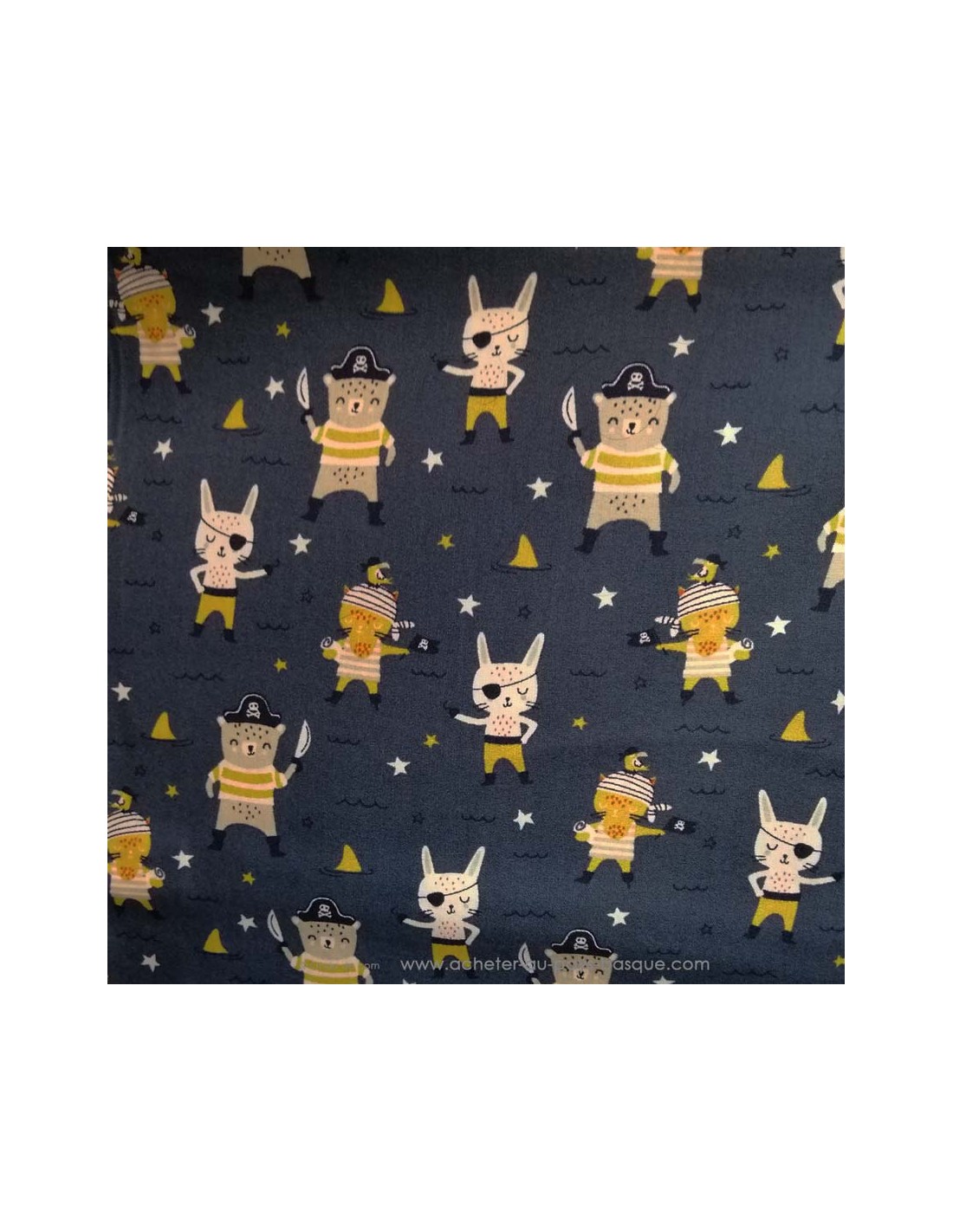 Joli tissu habillement pour enfant en Coton Oeko-Tex imprimé étoiles et animaux pirates sur fond bleu marine