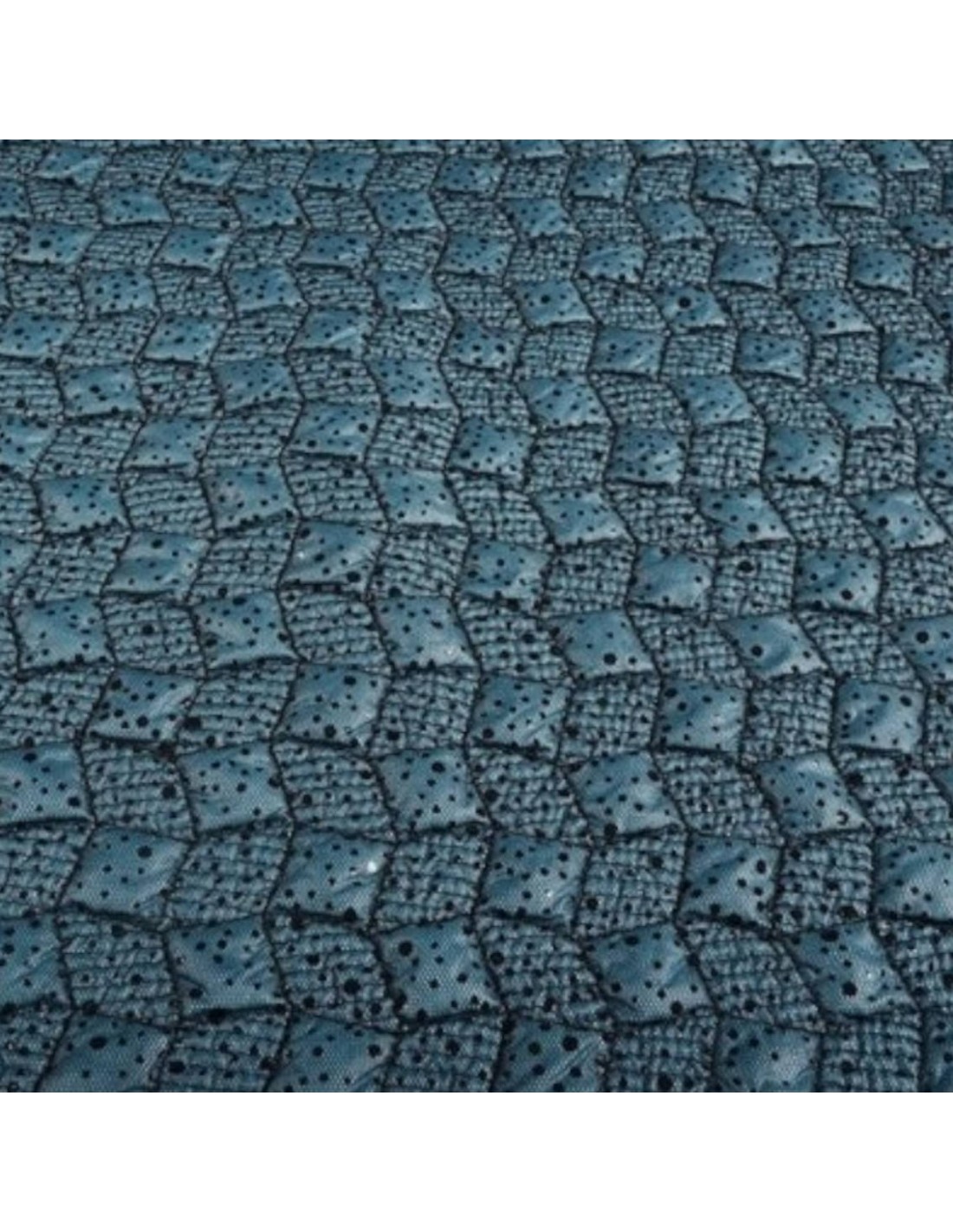 Joli tissu matelassé, composé d'une fine couche de ouatine, d'un tissu coupe vent bleu et recouvert d'une résille, tulle à pois noirs. Il est parfait pour vos cousettes type vestes, doudounes légères fantaisies...