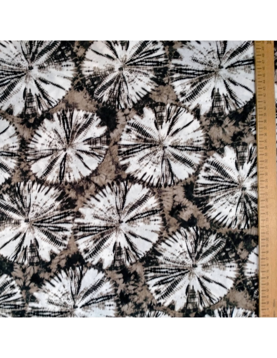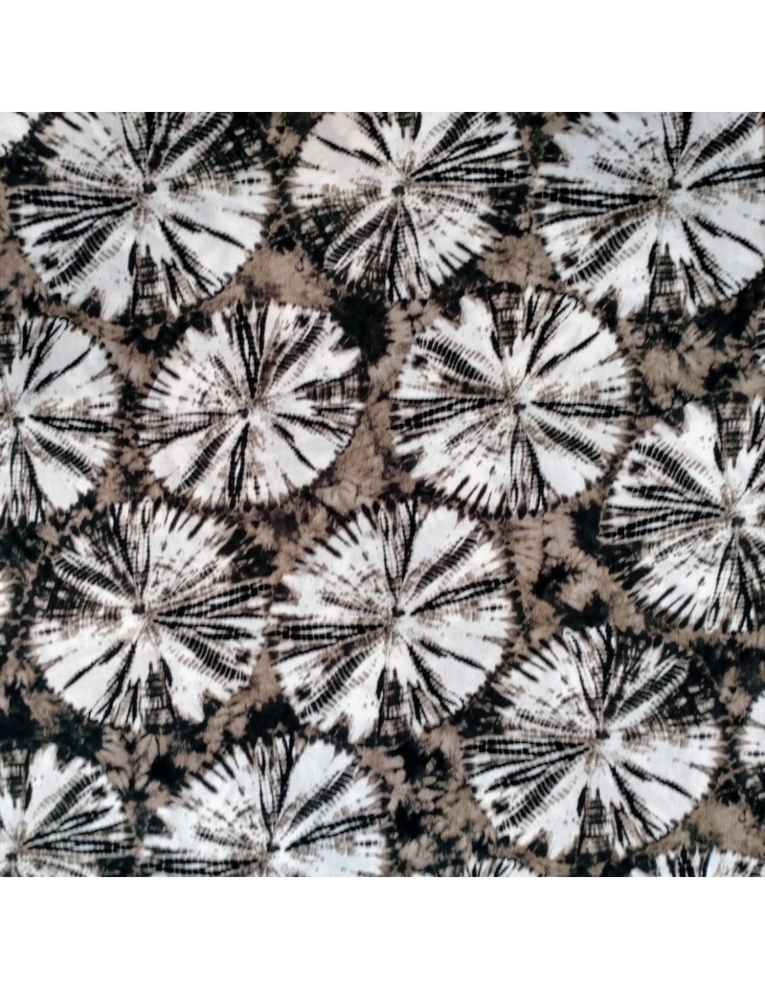 Tissu dans l'air du temps avec ses motifs tie and dye taupes et noirs , doux et fluide, il est idéal pour des cousettes du type jupe, pantalon, robe, veste...