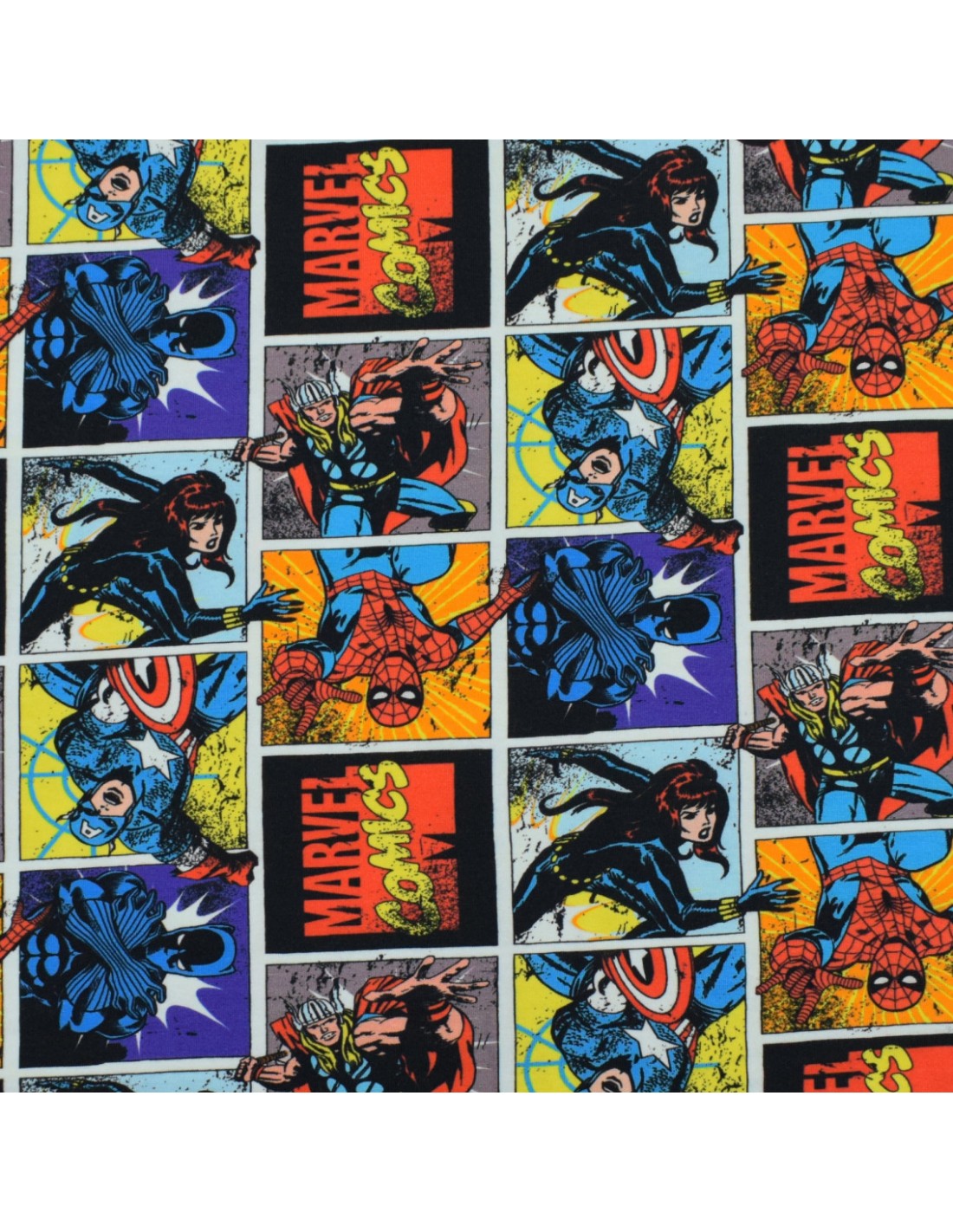 Ce Jersey de coton multicolore Disney pour enfant impression bande dessinée des personnages Marvel, avec Spiderman, Black Widow, Thor, Black panthère et Captain America est doux au toucher et extensible ce qui le rend parfait pour vos cousettes type t-shirt, jupes, pantalons et robes...