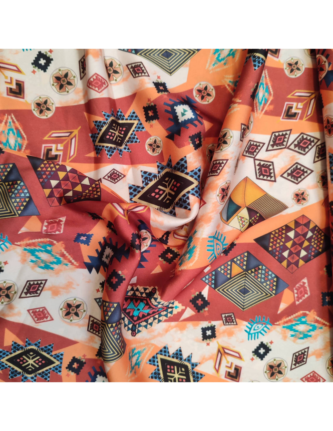 Tissu doux et fluide, satin de polyester esprit ethnique, orange beige et turquoise, il est idéal pour des cousettes du type chemisier, jupe, robe, top, foulard...