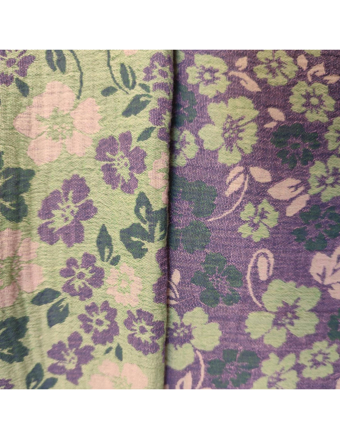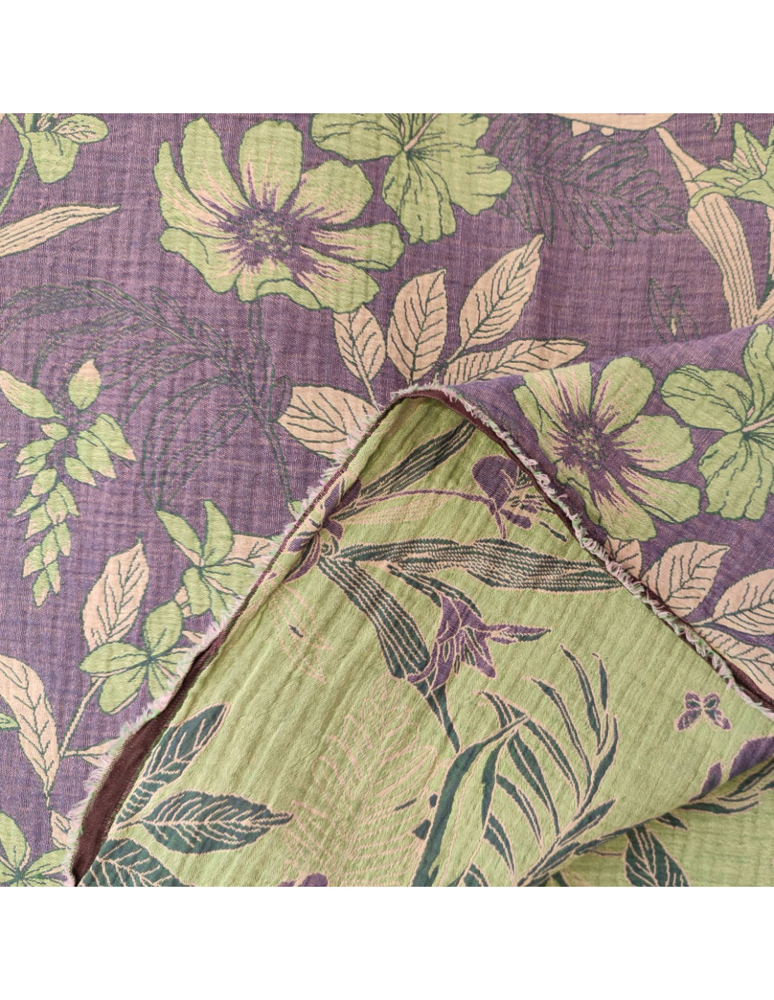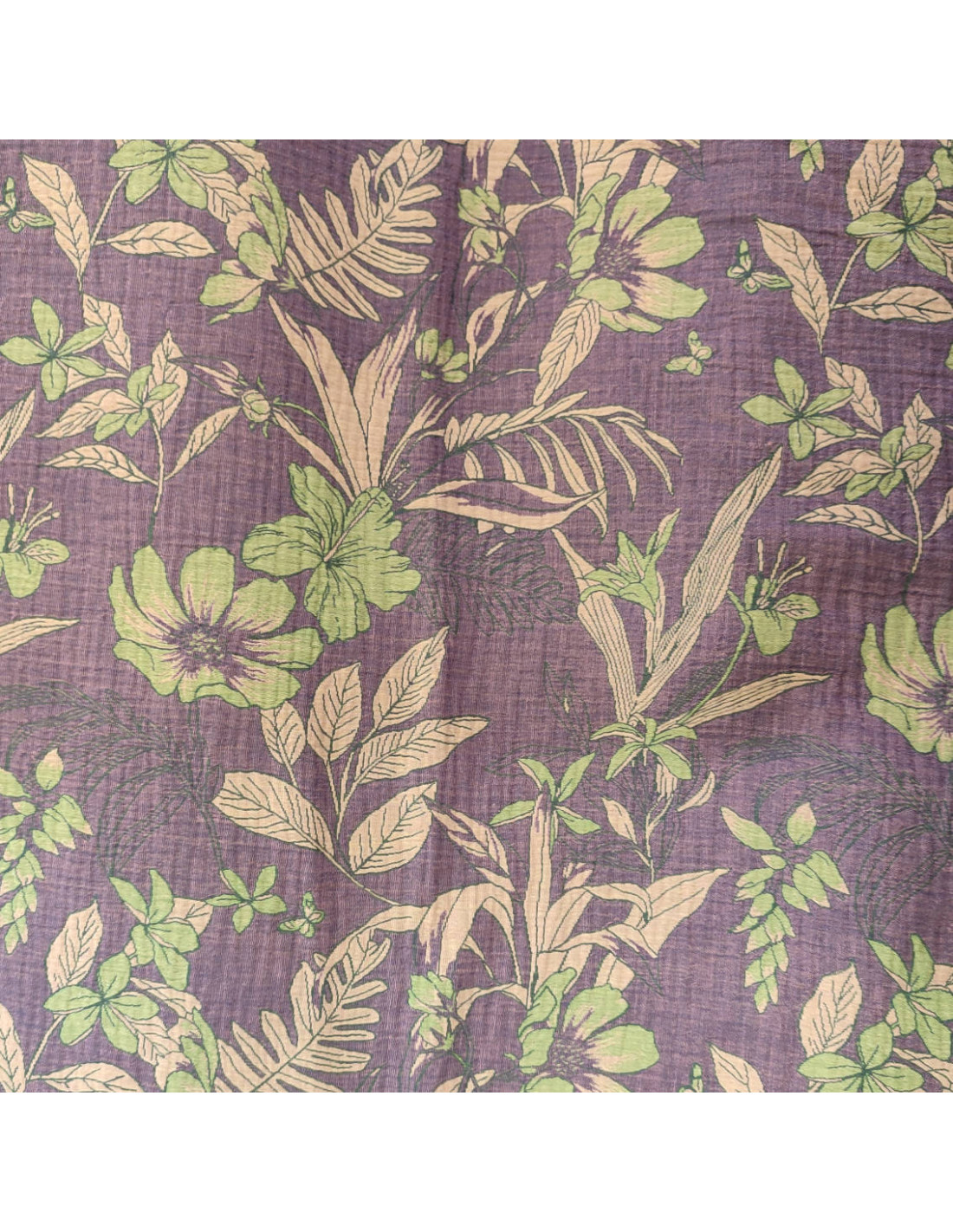 Tissu estival double coton gaze fleurie violette fleurs vertes, il est idéal pour des cousettes du type chemisierjupes, robes, tops, pantalon d'été, écharpe, sarouel, langes, bloomer, chèche ...