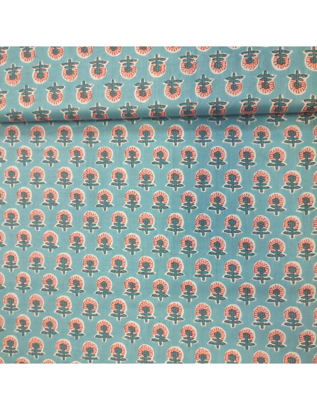 Tissu voile de Coton bleu ciel petite fleur rose - Esprit indien
