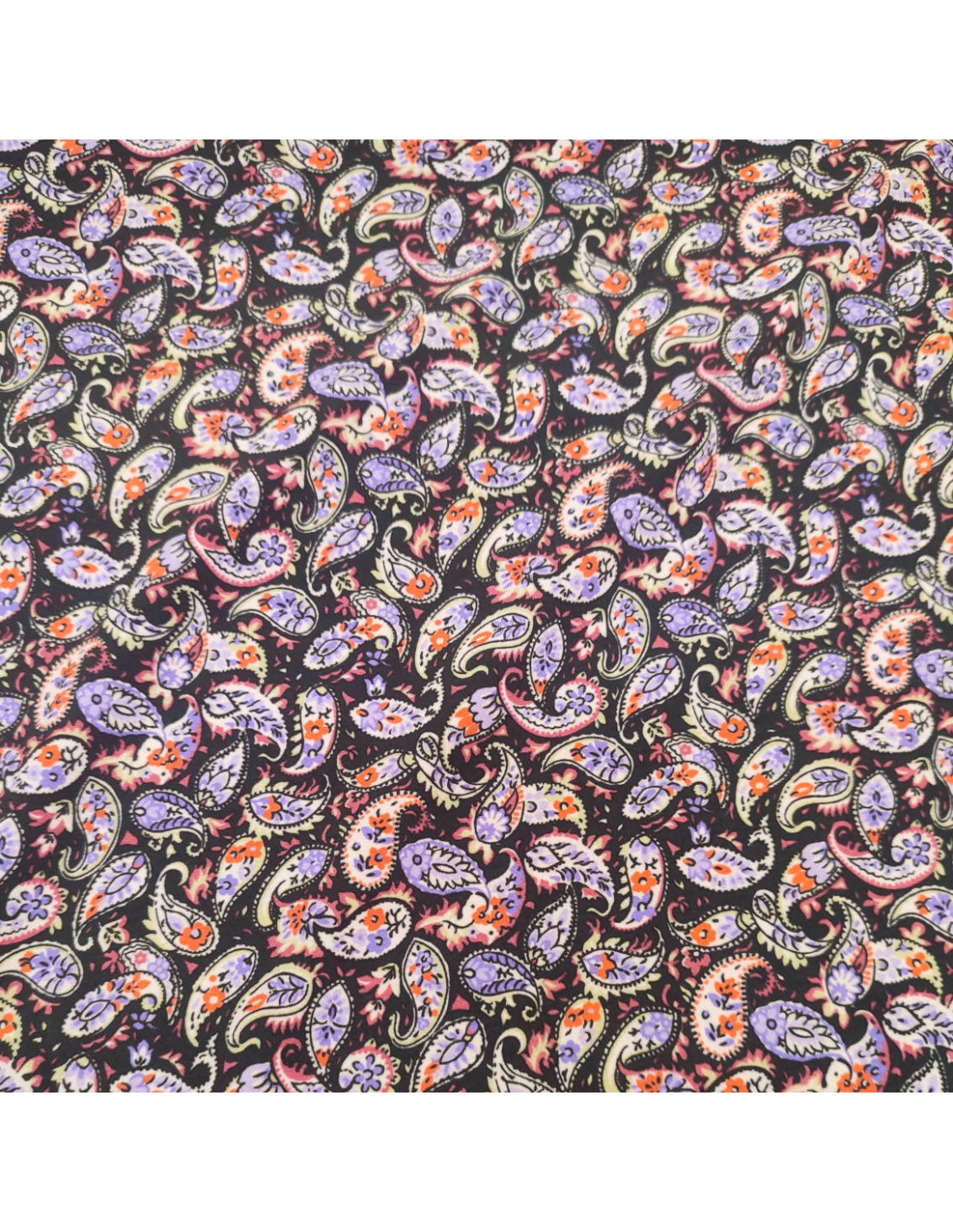 Tissu Jersey viscose motif de paisley / cachemire violet et orange sur fond noir, jolis motifs que l'on peut aussi retrouver sur les bandanas, doux et extensible ce qui le rend parfait pour vos cousettes confortables type t-shirt, pantalons fluides ou type legging ou encore robes et jupes...