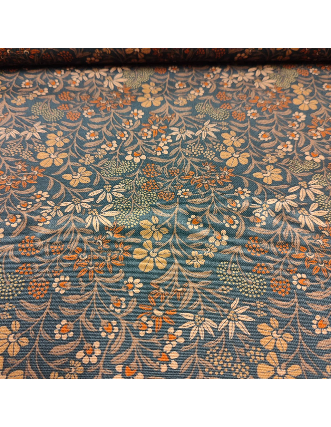 Tissu canevas coton certifiée Oeko-Tex bleu marine aux motifs floral, petites fleurs et feuillage rouille marron beige, Idéal pour des vêtements avec tenues tels que des shorts, surchemise et jupes mais aussi des accessoires, sacs, pochettes, trousses, patchwork, quilting et autres...
